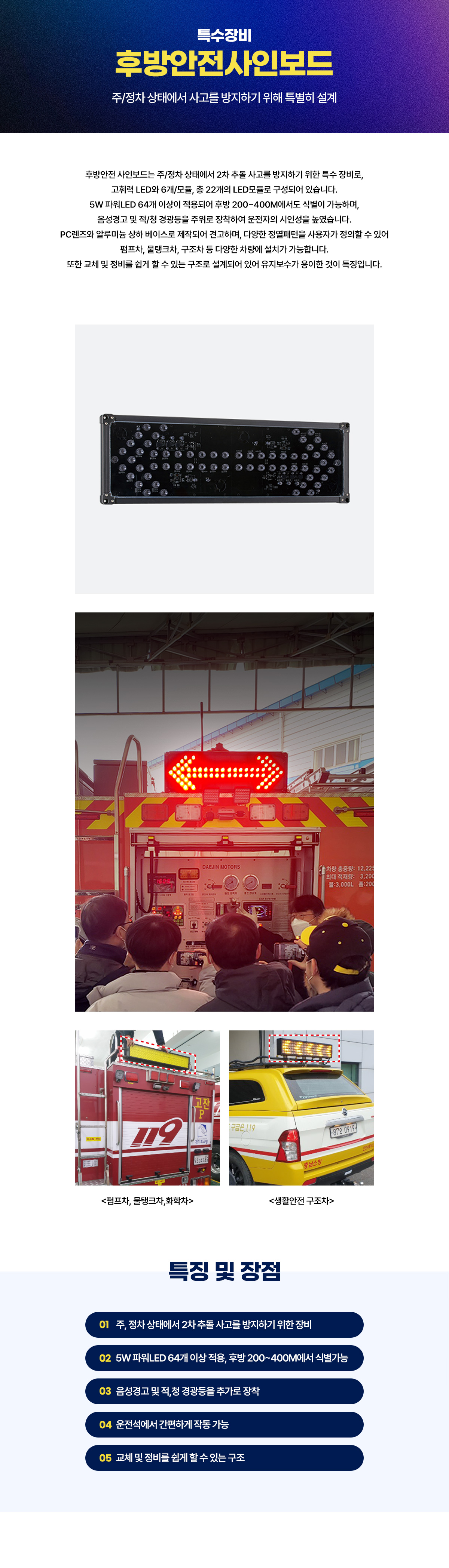 후방안전 사인보드는 주/정차 상태에서 2차 추돌 사고를 방지하기 위한 특수 장비로, 고휘력 LED와 6개/모듈, 총 22개의 LED모듈로 구성되어 있습니다. 5W 파워LED 64개 이상이 적용되어 후방 200~400M에서도 식별이 가능하며, 음성경고 및 적/청 경광등을 주위로 장착하여 운전자의 시인성을 높였습니다. PC렌즈와 알루미늄 상하 베이스로 제작되어 견고하며, 다양한 정열패턴을 사용자가 정의할 수 있어 펌프차, 물탱크차, 구조차 등 다양한 차량에 설치가 가능합니다. 또한 교체 및 정비를 쉽게 할 수 있는 구조로 설계되어 있어 유지보수가 용이한 것이 특징입니다.